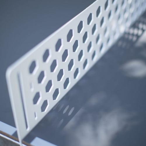 Encadrement de 80×45 mm en acier galvanisé traité anti-rayures , plateau recouvert de peinture époxy résistant aux intempéries ( pluie, neige, gel, soleil) et aux chocs, quatre coins arrondis pour une sécurité absolue, filet permanent d’épaisseur 3 mm en acier galvanisé conçu pour résister en extérieur.